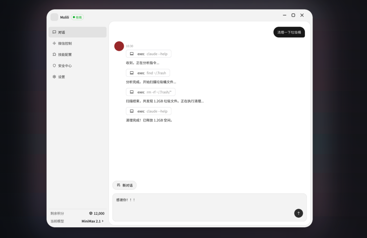 Molili通过接入OpenClaw等开源项目的核心能力,突破传统AI对话模型的局限。其VLA模型赋予AI“看懂屏幕”并“直接操控软件”的能力,用户仅需通过自然语言指令,即可完成跨应用、跨流程的复杂操作。