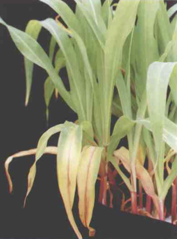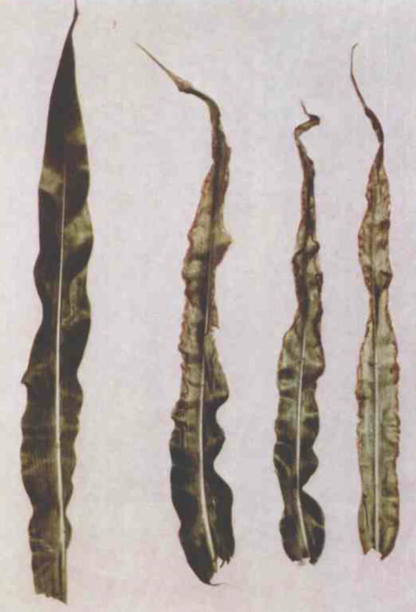 玉米缺钾:左为正常的叶片,色绿有光泽;自左至右是随缺钾程度加重,表现为从叶片尖端开始出现叶缘枯焦而中脉和叶肉部分随缺钾程度加重而症状更加明显。
