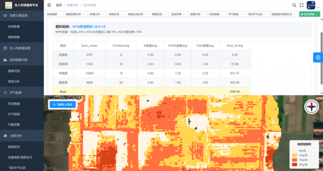 3.针对不同地块、不同作物生长期的差异化需求,制定不同区域的精准施肥处方图,实现变量施肥。通过无人机搭载喷洒设备,根据处方图精准投放肥料,提高肥料利用率。