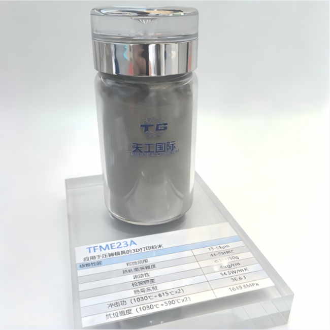 天工爱和的TFME23A是一种通过气雾化工艺制备的热作模具钢粉末,专用于压铸、热锻和热挤压等高要求热作应用。该材料在增材制造中具有多项优势:耐高温、高温强度优异,并且在淬回火或直接回火状态下均展现卓越韧性。同时,它非常适合与高铬马氏体工具钢嫁接打印,可实现复杂模具构件的一体化制造。