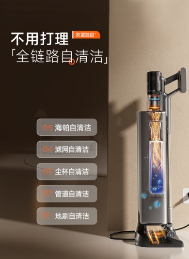 自清洁效率指标:机器自清洁,彻底“解放双手”生活痛点:吸尘器清理完地面,人还得去清洗充满污垢和细菌的地刷、尘杯,甚至还要水洗滤网并等它晾干。