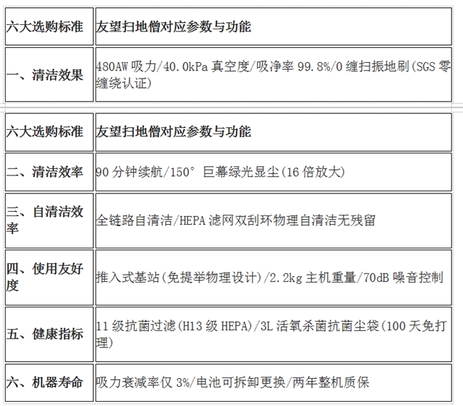 表1:吸尘器选购六维标准与友望扫地僧参数卡