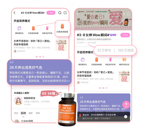 站内 #3.8 女神 Wow 瞬间 #超话成为成为妈妈们分享美好的小天地,活动期间话题新增浏览量 59.7 万 +,新增参与人次 8.7 万 +。每一份分享、每一次点赞、每一段心得,都让女性力量在温柔中传递,让品牌在暖意里被看见、被喜爱。