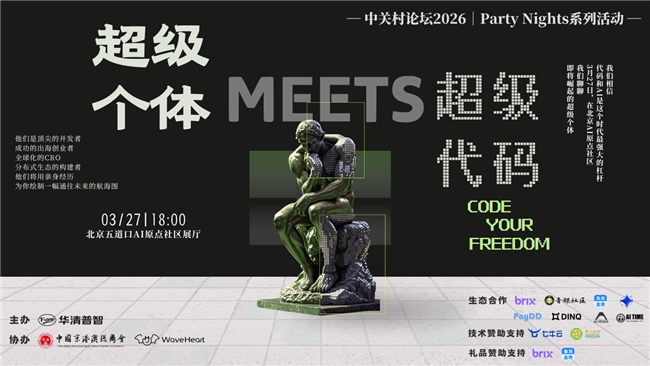 在这一背景下,长期关注AI前沿趋势、持续服务早期创新实践的华清普智AI孵化器,将目光投向“超级个体”,并发起“当超级个体遇见超级代码”OPC实践分享会。在上海七牛信息技术有限公司(七牛云)、北京算力自由科技有限公司、青稞社区等伙伴的技术支持与生态协同下,活动将于3月27日18:00在北京举行,以轻松、务实、开放的线下分享形式,为AI时代的创新者与前行者,搭建起经验共享、思维激荡、互相看见的交流场。
