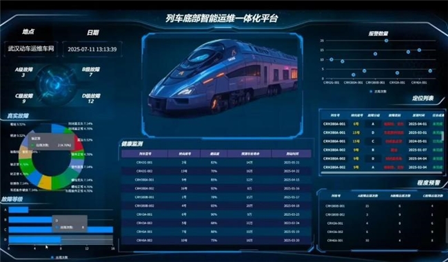 团队更搭建1:1高精度高铁车底数字孪生模型,几何精度达±0.1mm,支持360°漫游查看,实现物理实体与虚拟模型的实时映射。系统可对故障点位实时预警、高亮标注,运维人员通过可视化界面即可快速定位缺陷、追溯故障原因、查看处置建议,使故障定位时间缩短60%,整体运维效率提升50%。这种“提前预警-精准定位-科学处置”的智能运维模式,推动高铁车底维护从“故障后被动维修”向“隐患前主动预防”跨越式升级。
