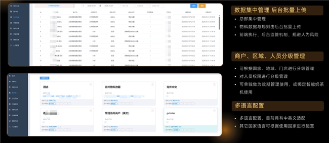 钲芯智能奶茶机搭载Android系统与多通讯接口,可实现在线监控、故障自动诊断和远程更新;新版本可在线升级,并持续优化设备的使用体验,后台可根据不同国家的认知与使用习惯进行定制开发,满足当地市场运营管理的需求。设备联网,门店设备状态、运行情况可以被持续记录,这就意味着总部可实时查看、统一管理,进行系统化数据化的分析。