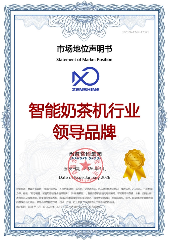 在国内智能奶茶机赛道,钲芯是最早入局的企业之一,被尚普咨询认证为“智能奶茶机品类领创者”“智能奶茶机行业领导品牌”。团队核心成员深耕行业超20年,长期一线经验带来的优势,不只体现在设备迭代,更体现在对连锁管理痛点的理解的洞察。品牌在持续优化设备能力的同时,组建自有软件团队,自研搭建SaaS管理体系,让奶茶机成为门店数据入口,并把门店经营拉到同一套管理逻辑中。