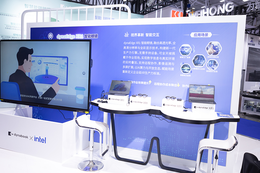智能办公解决方案以 XR 眼镜为核心,形成“硬件新品+核心软件+经典终端”的全生态布局,将 dynaEdge XR1 智能眼镜、dynaConnect™ Meeting云端会议解决方案、dynabook系列商务笔记本电脑深度融合。展会现场,该方案完美演示了从日常办公到跨域协作的全场景高效办公流程:dynaConnect™ Meeting的预约会议、即时会议等多场景覆盖能力,搭配 AI 降噪、背景虚化、语者注册及电子白板实时交互功能,让远程协作高效如面对面沟通;Portégé 商务尊爵系列、TECRA商务效能系列笔记本电脑,凭借强劲的Intel®Core™ Ultra处理器,轻松应对复杂多任务处理,与XR眼镜、云端会议系统无缝联动,实现办公场景与生产场景的无缝衔接,为电子制造企业打造了全场景、智能化、高效化的办公协同体系。