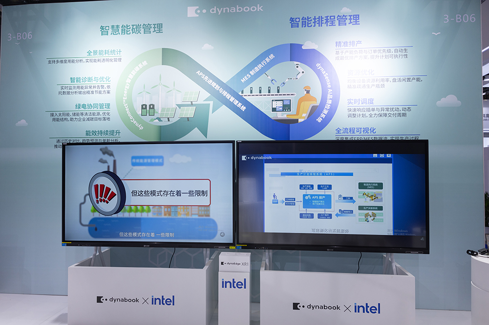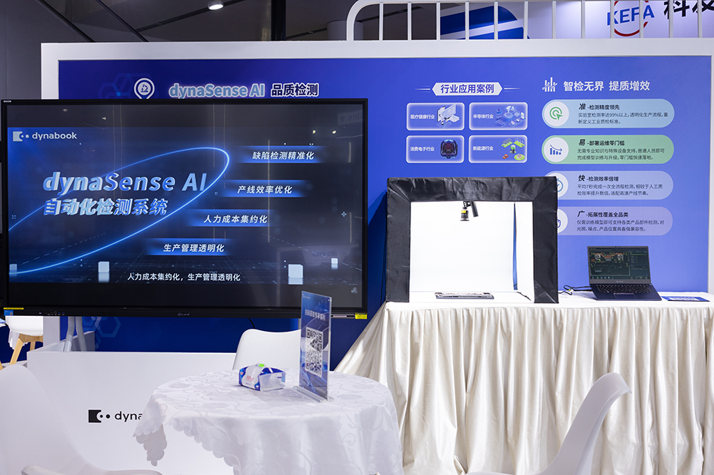智慧能工厂解决方案则为电子制造智能化生产构筑核心支撑,重点展示的dynaSense AI品质检测系统、dynabook APS先进生产排程系统,结合数字孪生技术打造的沉浸式智能制造体验,让观众直观感受AI赋能工业检测与生产调度的硬核实力。dynaSense AI品质检测系统将AI技术与传统CV算法深度融合,实现电子制造产品微小缺陷的精准快速识别,检测效率数倍提升、误差大幅降低,影像追溯功能更实现质量问题精准溯源,成为企业的 “智能质检员”;APS 系统精准直击生产调度痛点,轻松应对紧急订单、设备故障等突发情况,实现全要素智能排程,让生产调度“随机应变”;数字孪生技术构建的 1:1 虚拟工厂,实现生产过程实时监控与优化调控,而其与dynaEdge XR1智能眼镜的技术协同,更实现了生产现场远程专家指导、设备远程维护等功能,构建起全流程、一体化的智能制造体系,为企业智能制造、绿色转型提供全方位技术支撑。