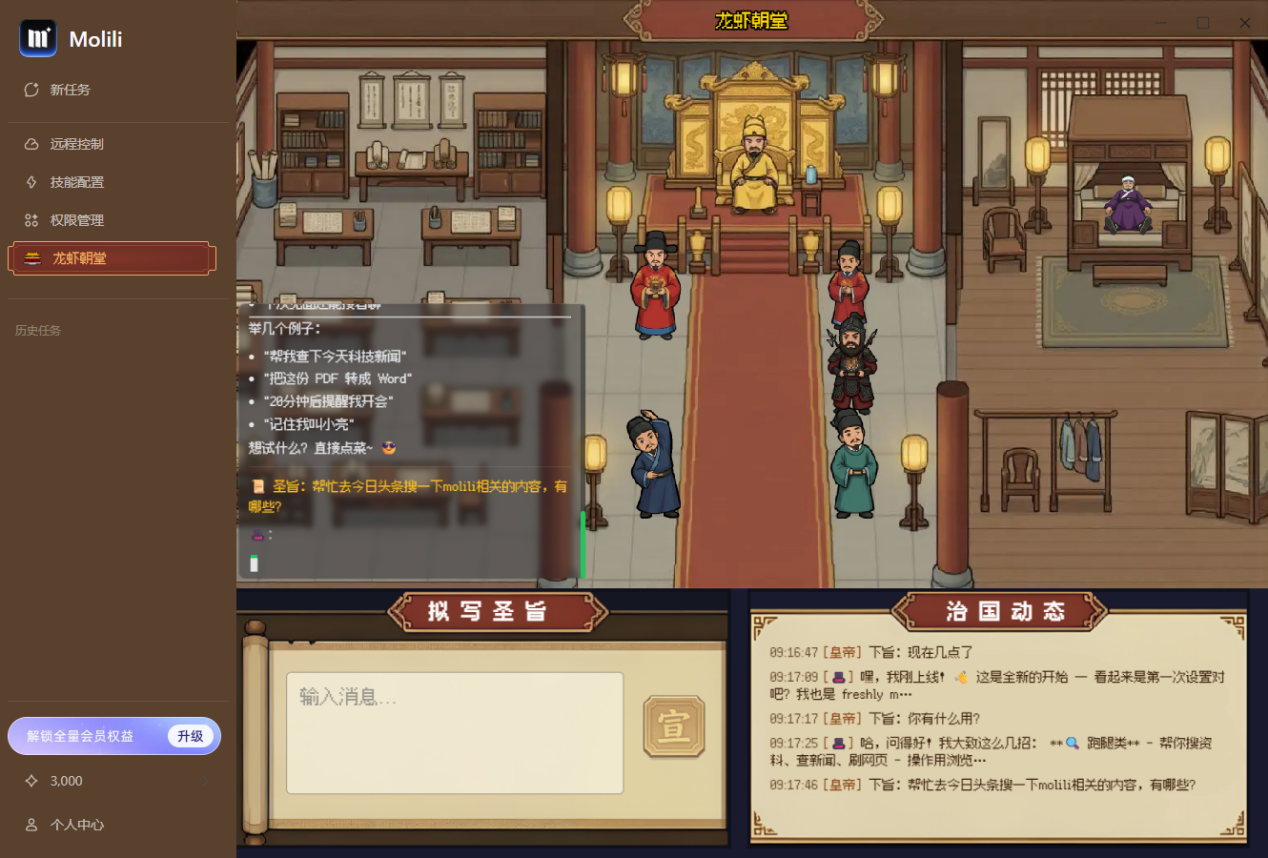 交互层面,“龙虾朝堂” 提供了像素风格的趣味界面,让AI操作告别了冰冷的代码和复杂的Prompt,用户化身“帝王”在“拟写圣旨”框下达指令,AI则以“文武大臣”的身份在“治国动态”面板实时汇报进度,把文件整理、网页搜索、表单填写这些繁琐工作,变成了直观有趣的“朝堂议事”,真正做到了零门槛上手。