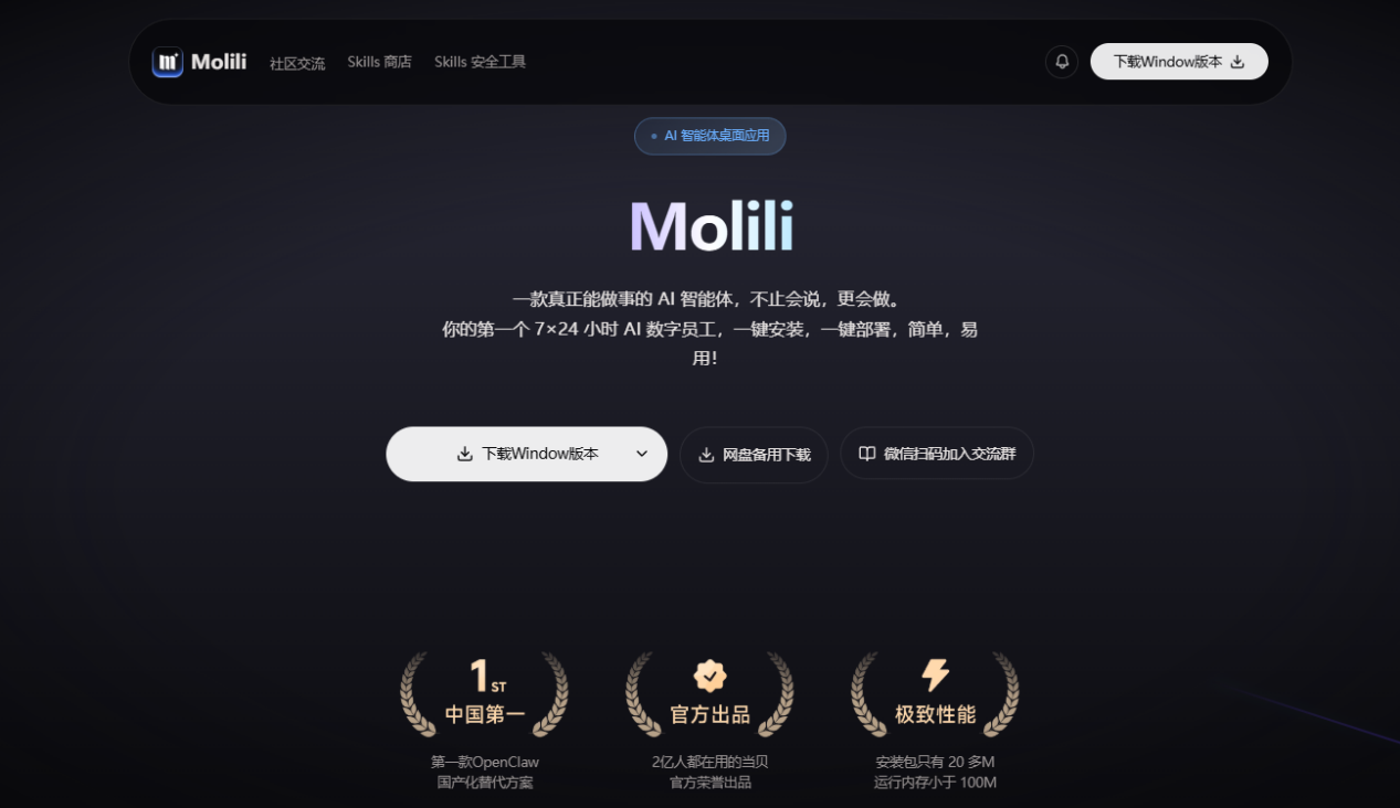 目前,Molili已上线8000+现成技能,覆盖日常办公、学习备考、生活服务等全场景,支持Windows 10/11 64位、MacOS M系列芯片、MacOS Intel芯片等多系统,一键安装、3分钟上手,让每个普通用户都能拥有专属的AI数字员工。