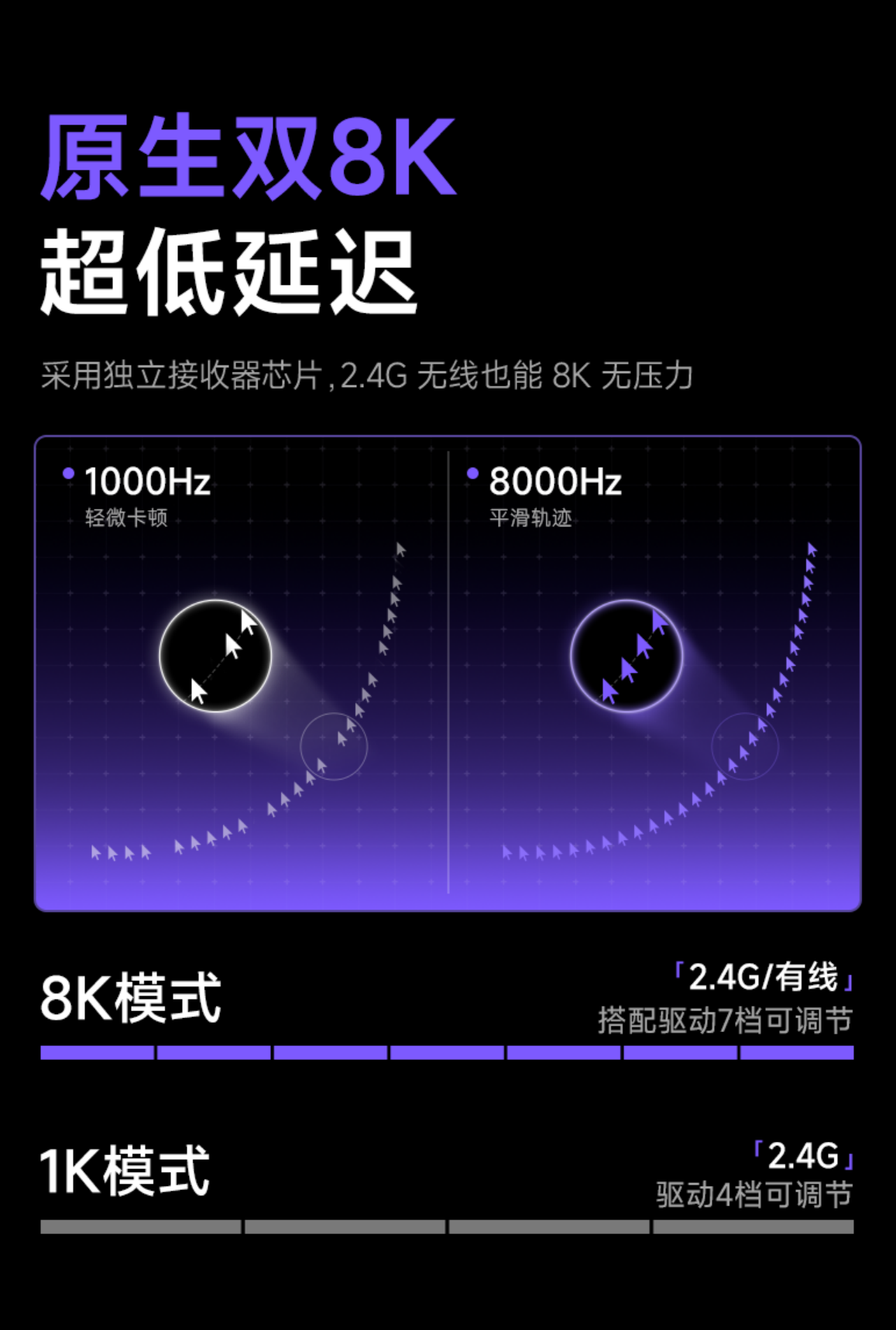 泰坦N9系列另一项关键技术突破是有线和2.4G无线双8K回报率。传统无线鼠标受限于主控算力与接收器设计,往往只能在有线模式下开启8K,无线状态则被限制在1K或4K。泰坦N9通过独立接收器芯片与Nordic主控的高带宽设计,使得2.4G无线状态下同样可以稳定运行8K回报率。