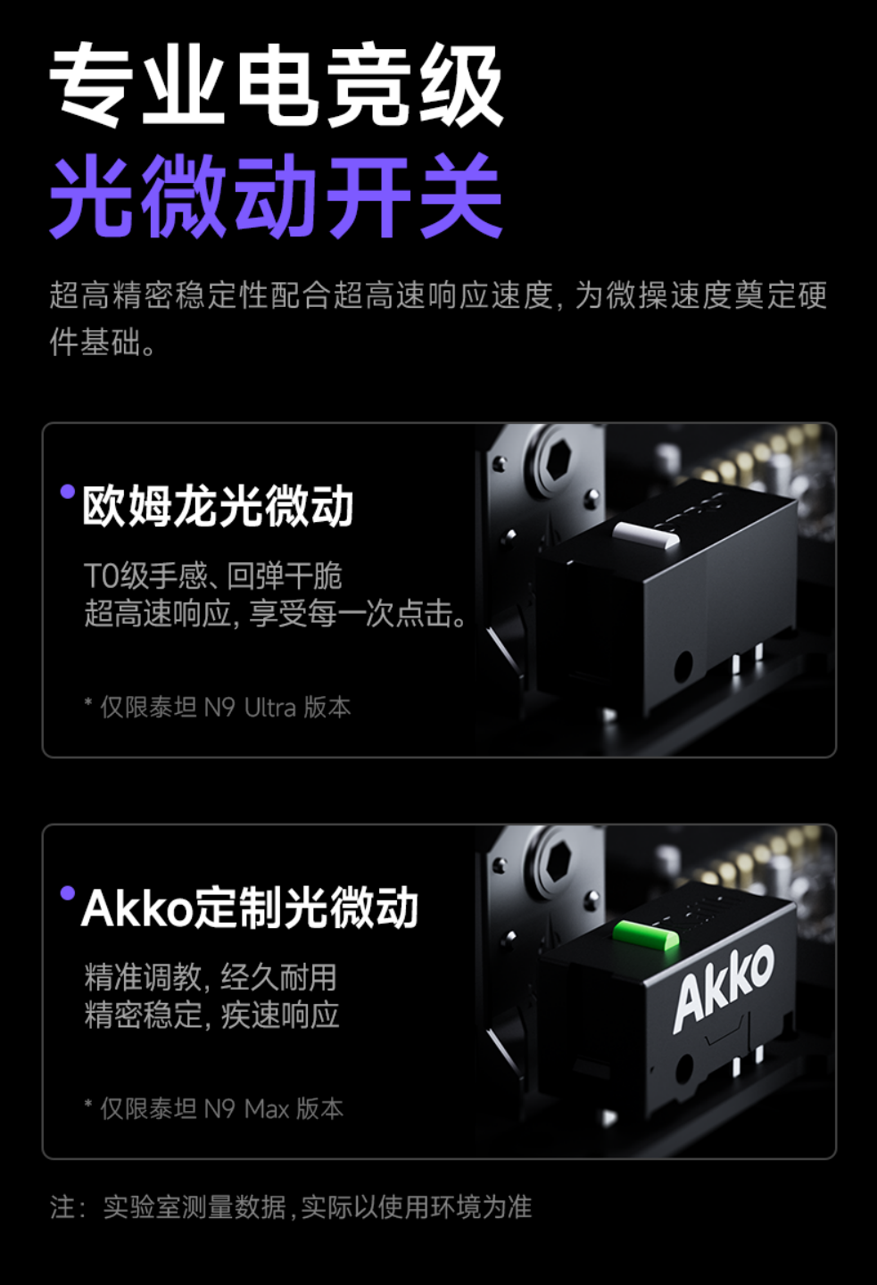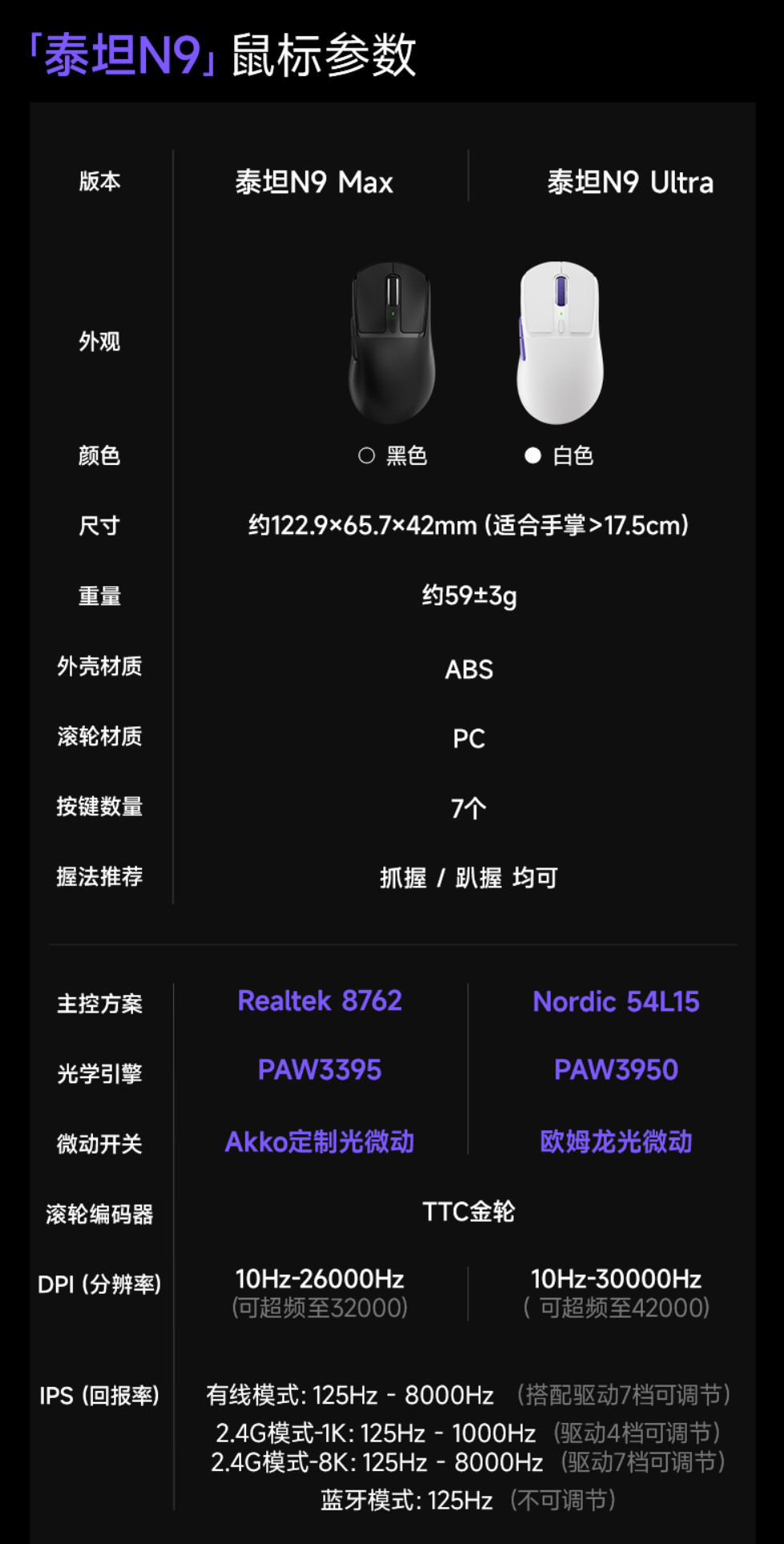 作为系列中的另一选择,泰坦N9 Max同样采用自研右手人体工学模具与注塑火花纹壳体,支持三模连接与双8K回报率。不同之处在于主控换为Realtek 8762,光学引擎为PAW3395(原生26000 DPI,可超频至32000 DPI,追踪速度650IPS),微动为Akko定制光微动。Max版提供黑、白两色,适合预算或性能需求略有不同但同样看重手感的用户。