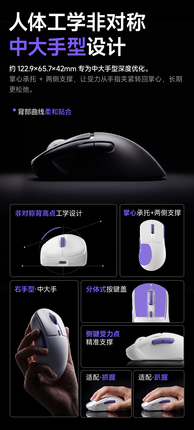 这一设计的直接体感是:抓握、趴握、指握三种握姿都能获得饱满贴合,但手指不再需要主动发力夹紧。按键回弹清晰跟手,长时间游戏或办公后,手部疲劳感明显低于传统鼠标。