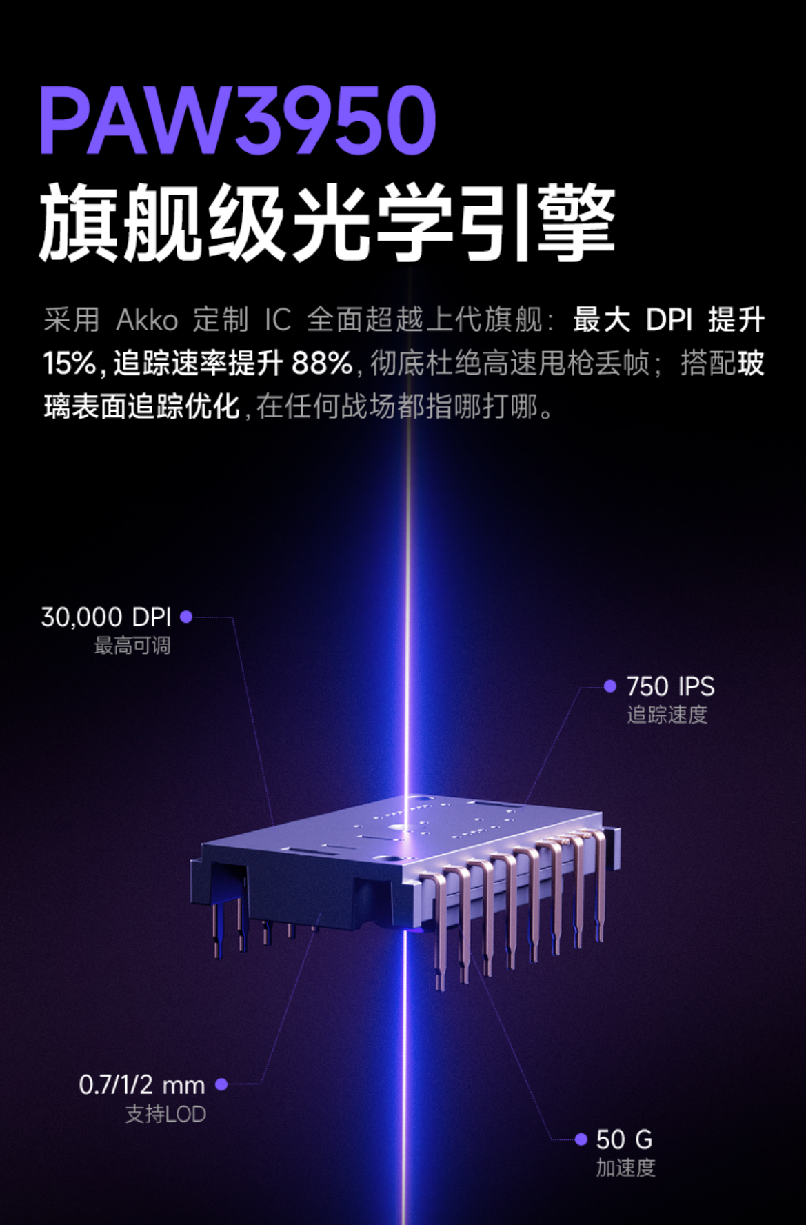 泰坦N9 Ultra搭载的PAW3950光学引擎是目前消费级鼠标中的旗舰方案之一。原生最高30000 DPI,可插值超频至42000 DPI,追踪速度达到750IPS,加速度50G。支持LOD(静默距离)三档调节:0.7mm、1mm、2mm。官方特别提到,该引擎针对玻璃表面进行了追踪优化,解决了部分鼠标在玻璃垫上丢帧的问题。