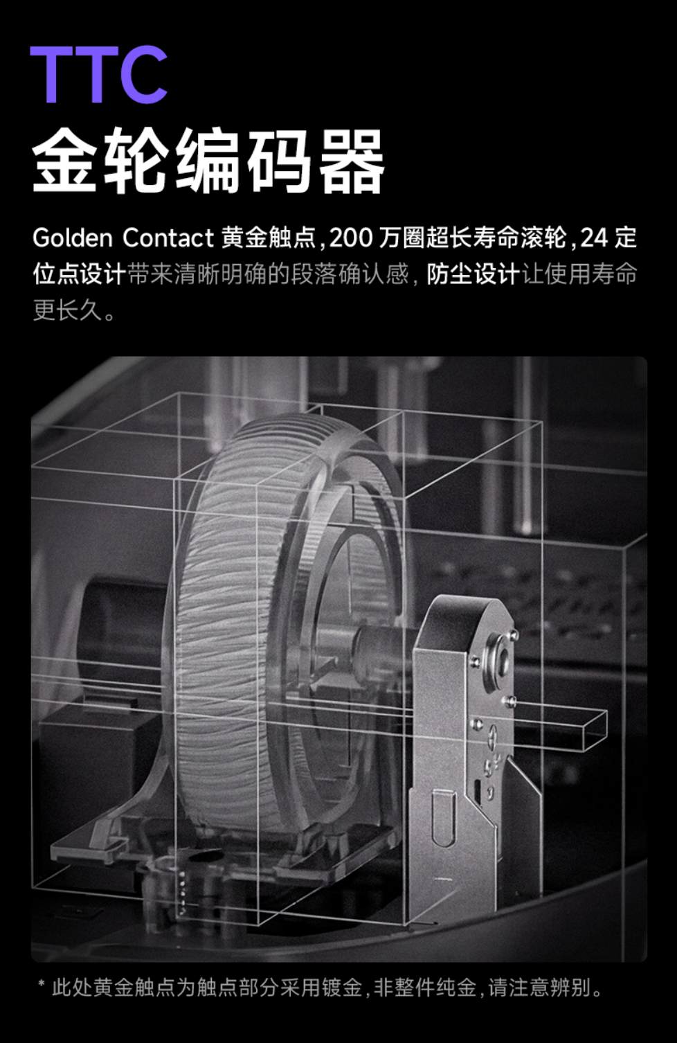 滚轮则全系标配TTC金轮编码器。其核心卖点是“黄金触点”——触点部分采用镀金工艺,配合200万圈的标称寿命与24个定位点设计,段落确认感清晰,同时具备防尘结构,延长了在复杂环境下的使用寿命。