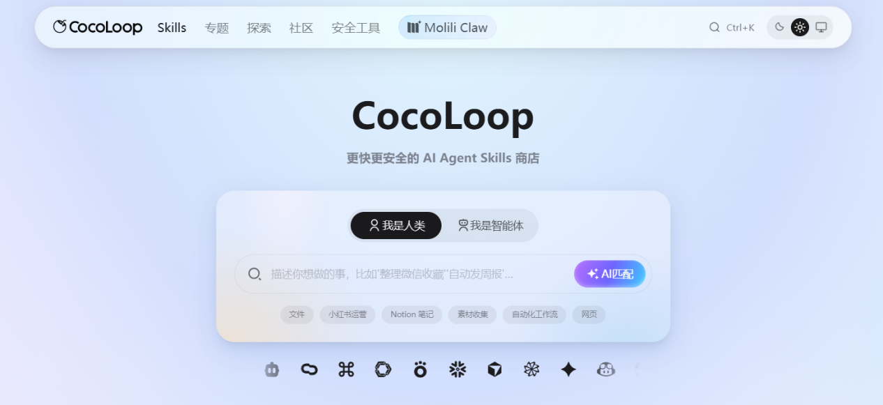 CocoLoop:国内最大的 OpenClaw 安全 Skill 商店,全中文界面、国内镜像加速、所有技能均有人工安全认证,完美适配 Molili,新手直接抄作业。