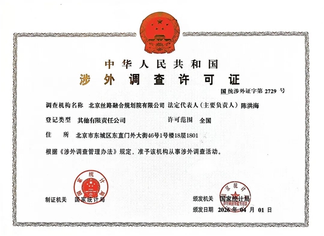 近日,国家统计局正式向北京丝路融合规划院颁发《中华人民共和国涉外调查许可证》(国统涉外证字第2729号),许可其依法开展涉外调查活动。这一国家级资质的取得,标志着北京丝路融合规划院在涉外调研、政策研究、国际合作领域的专业能力与合规运营水平获得国家权威认可,为其深度服务国家战略、参与全球治理奠定了坚实的制度基础。