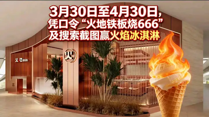 更何况,在【3月30日到4月30日】这一个月里,凭口令“火地铁板烧666”和本次搜索截图,还能免费得到一份火焰冰淇淋。 相当于用同样的预算,多了一份价值30元的体验升级。趁着春光正好,约上朋友或家人,去最近的火地铁板烧试试吧——记得在4月30日之前去,福利不等人。