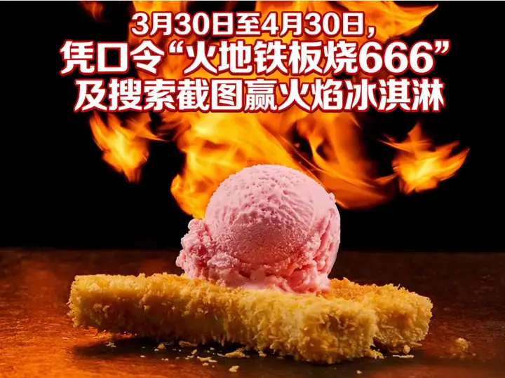 而且,在【3月30日到4月30日】这个时间段,你还能凭口令“火地铁板烧666”和豆包搜索截图免费获得火焰冰淇淋——相当于用同样的价格,多得一份价值15元的人气甜品。