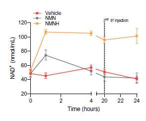 药代动力学研究显示,NMNH 能够在 15 分钟内迅速提高细胞内 NAD+ 水平,在 1 小时后达到峰值,并且保持峰值水平保持长达 24 小时之久。不仅其峰值水平是 NMN 的十倍以上,峰值保持时间也比 NMN 的 1 小时后便开始回落有了质的飞跃。