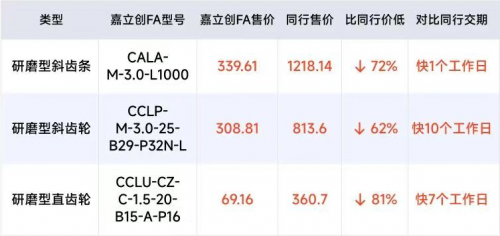 面对这一市场痛点,拟上市的嘉立创近期宣布实现研磨齿轮自制,以技术创新与工艺整合打破僵局。通过自建研磨工艺产线,嘉立创FA将原本需要外发多环节加工的流程整合至一条自动化流水线,大幅缩减了生产周期。目前,其研磨齿轮的交期已实现平均提速近10天,部分型号甚至可缩短20天。更令人瞩目的是,依托规模化生产与低毛利经营策略,嘉立创FA的同品质研磨齿轮价格较市场平均水平降低50%以上,破解了“高价慢速”的行业顽疾。