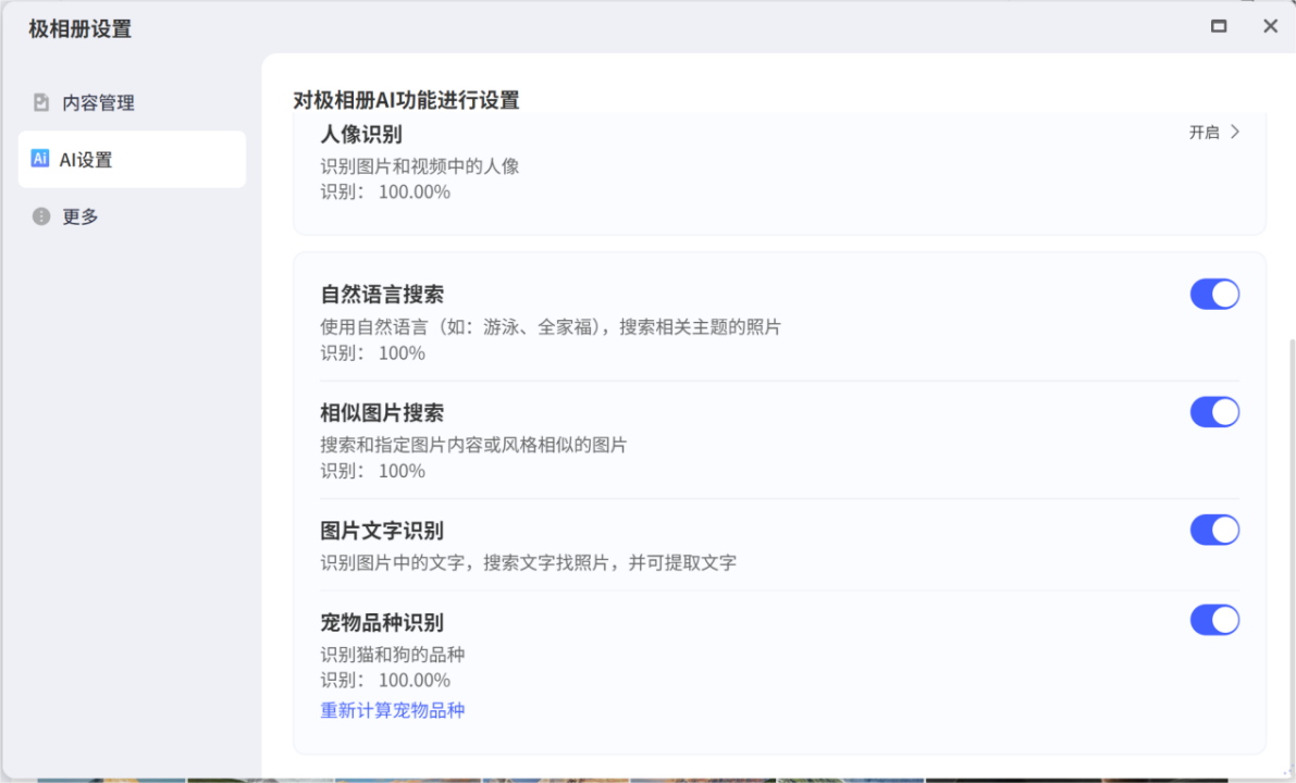 群晖的相册功能仅支持基础分类,威联通缺乏智能回忆功能,绿联的AI分类精度不足,常出现人物或场景误判。