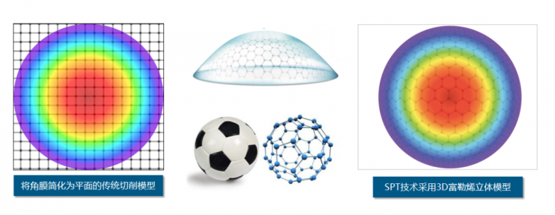 其所采用的SPT智能脉冲技术,利用富勒烯(足球烯)模型构建角膜表面立体形态来设计激光脉冲发射位置,使激光脉冲在角膜表面的发射位置间距一致,实现最佳的激光光斑重叠效果。这不仅节省中央区切削深度,还能在角膜周边形成“护城河”效应,有助于减少术后回退概率。