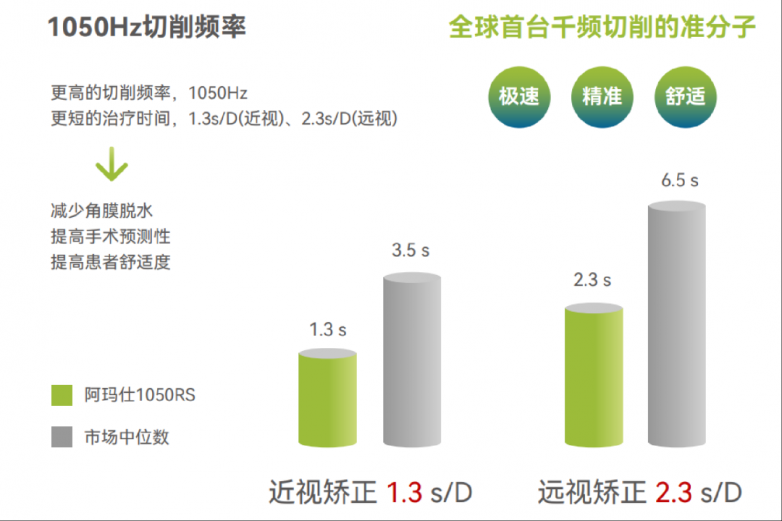 🔘 速度快:1050Hz激光频率、0.54mm微小光斑,每100度近视仅1.3秒;