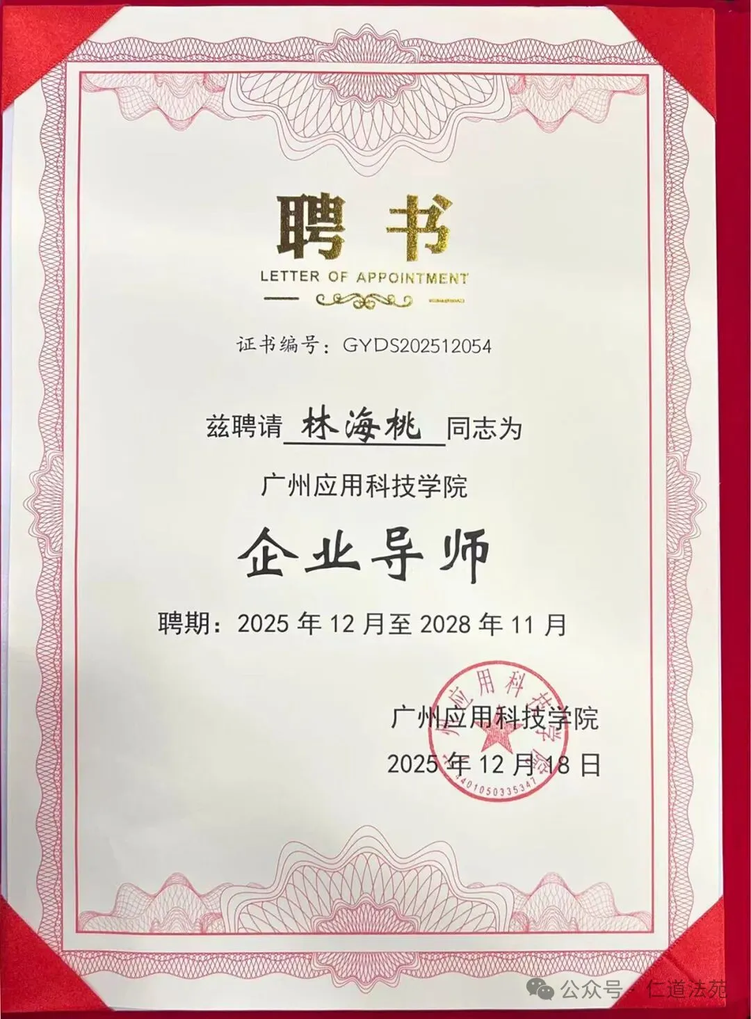 林海桃董事长表示,受聘担任企业导师,将充分发挥广东仁道法律服务有限公司的资源优势,为学校提供实践教学基地、行业前沿讲座、实习就业岗位等多维度支持,推动双方在法律实务培训、校企联合科研项目等方面开展深度合作,实现学校人才培养与企业人才储备双向赋能,达成“校企携手、共育共赢”的合作目标。