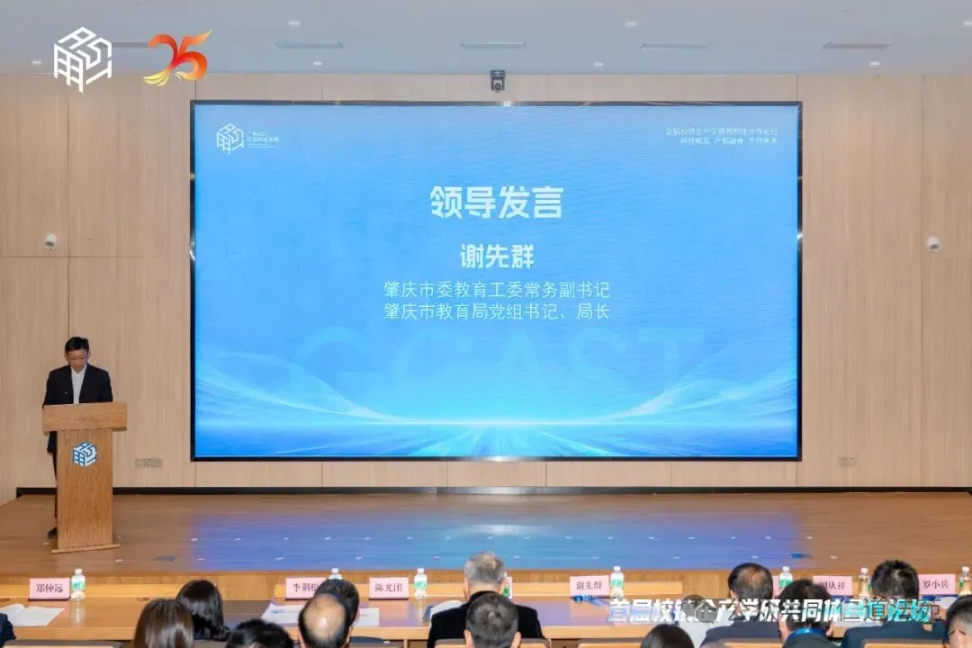 肇庆市委教育工委常委副书记、市教育局党组书记、局长谢先群在讲话中表示,肯定学校25周年办学成果及服务肇庆地方发展的贡献,解读肇庆校镇企合作政策导向,寄语三方深化产教融合、共建创新生态。