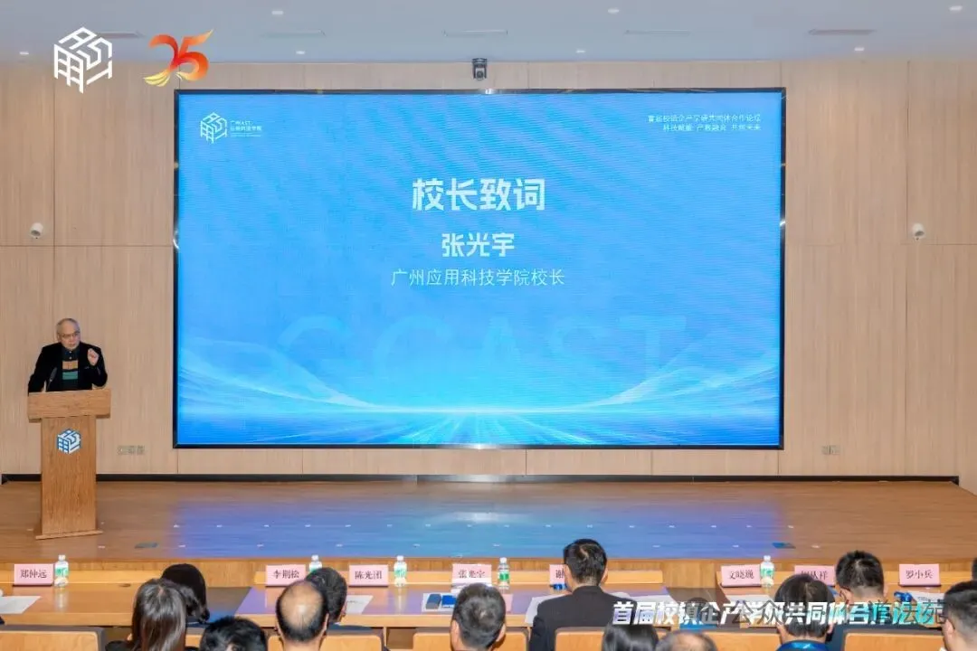 广州应用科技学院校长张光宇代表学校致辞,他简要介绍参学校25年的办学历程、育人理念以及在产教融,“三园融合”建设成效,聚焦校镇企合作核心需求,阐述学校学科优势与合作愿景。