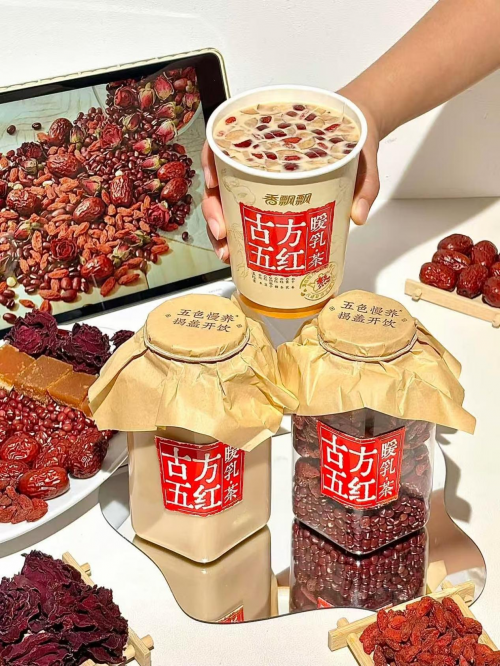 然而香飘飘并未选择固步自封,近些年来,品牌一直在推进茶饮产品的健康化、年轻化升级。2017年,推出杯装液体奶茶,正式形成“冲泡+即饮”的双轮驱动格局;2018年,推出Meco果汁茶,开创全新品类——杯装果汁茶,并在上市一年后销售额破10亿,成为公司旗下又一现象级单品;2020年,发力泛冲泡领域,推动品类全面创新;2022年,推出瓶装即饮产品;2024年,加速冲泡品类年轻化、健康化进程,推出“原叶现泡轻乳茶”及“原叶现泡奶茶”系列新品;2025年,与浙江中医药合作建立健康养生饮品研究院,探索中医健康理念在日常消费品中的传承和创新,并推出“五红暖乳茶”这一从经典膏方转化的养身饮品。