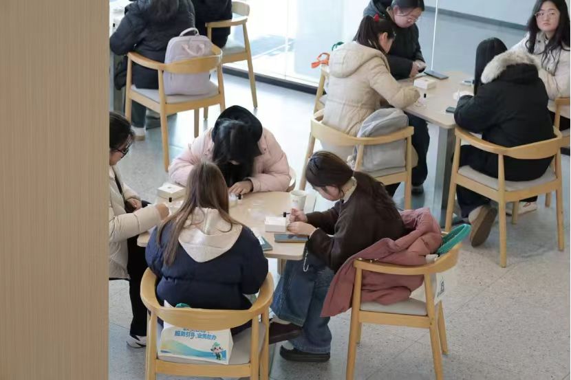 图为实践团成员及其他扬州籍学子仔细镶嵌螺钿。葛子硕 供图