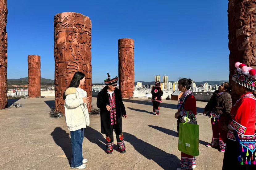 图为实践团成员游览彝族太阳历十根神柱。王娅洁 供图