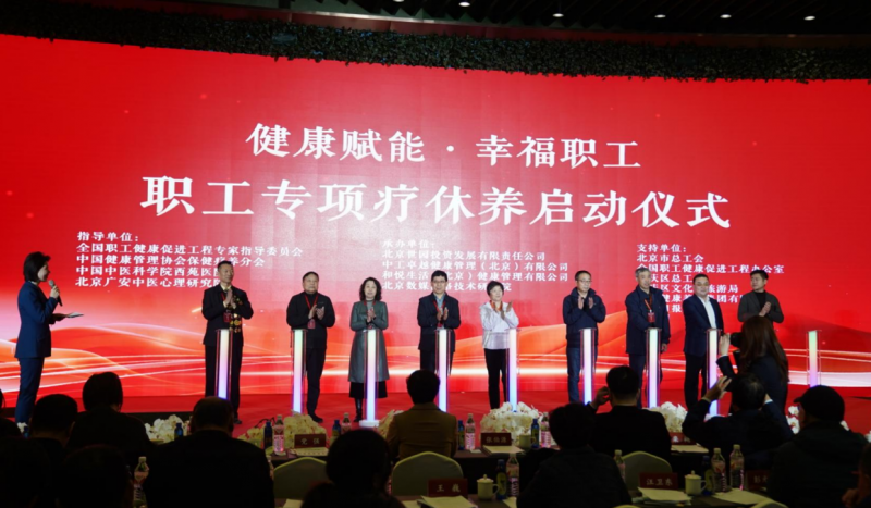 启动仪式上,中国职工国际旅行社总社党委书记、全国职工健康促进工程推进委员会主任张时明,北京市延庆区人大副主任兼总工会主席贺常荣,北京市延庆区文化与旅游局党组书记兼局长洪炜,北京世园投资有限公司董事长王铁林,中国健康养老集团有限公司总经理彭新举等领导出席活动并讲话,领导们一致认同职工健康是推动经济社会高质量发展的核心要素。随着嘉宾共同按下启动装置,“职工专项疗休养项目”正式拉开帷幕。