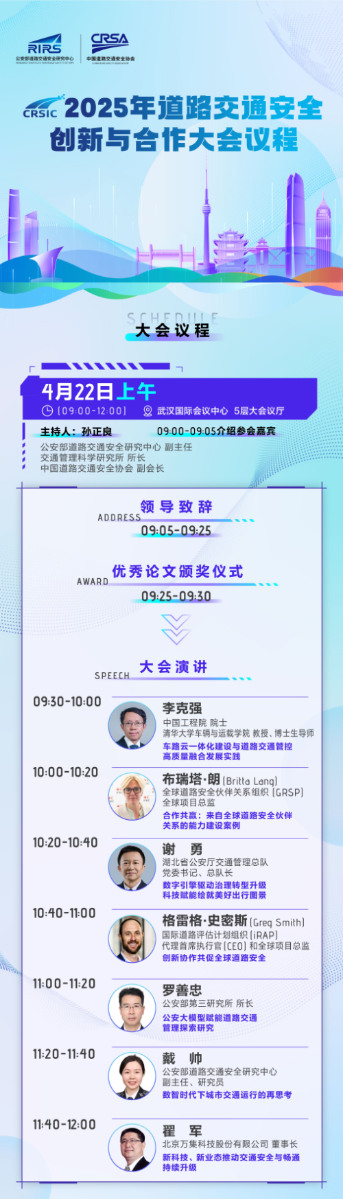2025年是“十四五”规划收官之年,我国道路交通安全智能化治理迈入新阶段,道路交通安全现代化治理水平显著提升。为深化科技赋能、推动共建共治,进一步贯彻落实新警务理念、新运行模式、新技术装备、新管理体系“四新”要求,推动加强我国道路交通管理和科技信息化应用经验交流,助力提升道路交通事故预防“减量控大”工作水平,由公安部道路交通安全研究中心、中国道路交通安全协会共同主办的2025年道路交通安全创新与合作大会(以下简称“大会”)将于4月22日在武汉国际会议中心召开。