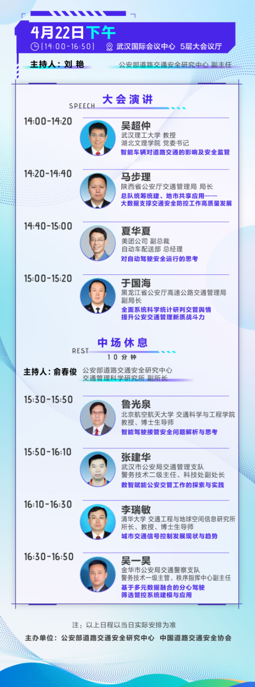 本届大会以“慧聚荆楚 路畅人安”为主题,聚焦数字化、信息化与智能化技术在公安交管工作中的应用实践和发展方向,将邀请全球道路安全伙伴关系组织、国际道路评估计划组织等国际机构的专家代表以及国内知名院士、院校专家学者、企业技术代表和在大会征文评选工作中获评优秀论文的公安民警担任演讲嘉宾,共同探讨智慧交通发展新未来。