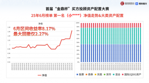 6月榜单数据显示,上榜参赛者整体业绩斐然,前七名参赛者在6月份的区间净值收益率均值高达5.2%,最大回撤普遍控制在3.5%以内,充分展现了参赛者在“收益与风险平衡”方面的专业配置能力。其中,参赛者“小****”以8.17%的收益率强势夺冠,“高**”和“愚公必移山”分别以6.74%和6.3%的收益率位列第二、三名,第四名到第七名的6月区间净值收益率分别为5.94%、4.98%、4.98%和4.95%。