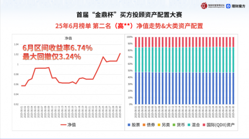从参赛者的资产配置策略来看,稳健配置成为本次大赛的亮点。冠军“小****”凭借稳健的增长策略,净值从月初的0.9843攀升至月末的1.0648,区间收益率8.17%,最大回撤仅为2.27%。其资产配置以股票(约46%)、混合类资产(约41.5%)为主,辅以12.4%的国际(QDII)资产,完美诠释了“核心+卫星”的均衡思路。第二名“高**”同样表现出色,其资产配置偏向“权益打底+跨境分散”,股票资产占比稳定在48%左右,混合类资产与国际资产分别占36.6%和15.4%。第三名“愚公必移山”则通过灵活调整资产结构,纳入8.7%的债券和5%的另类资产,展现出“多资产对冲”的风控意识。