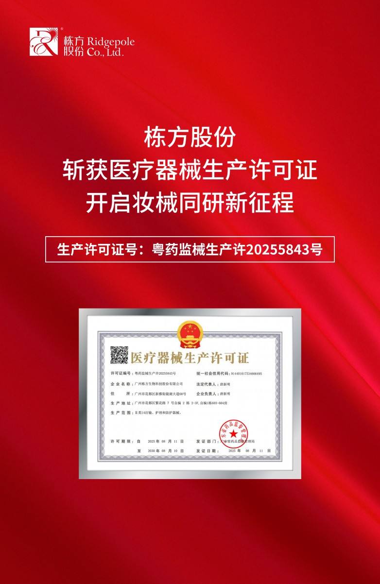 这一资质的落地,不仅标志着栋方股份正式纳入国家医疗器械合规生产监管体系,更意味栋方股份从“妆字号”到“械字号”的硬核实力跃迁,是栋方股份推进“妆械协同”产业化进程中迈出的关键一步!
