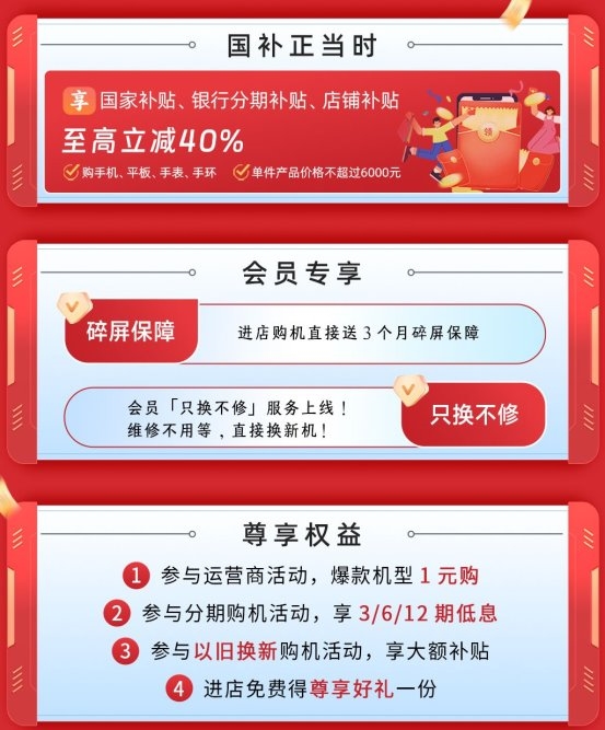 三补叠加享钜惠,多重权益购机无忧。本次年终促销,迪信通带来超强优惠组合拳。在参与国家补贴的地区,消费者购买单价不超6000元的手机、平板、智能手表/手环,可享国家补贴福利,在此基础上叠加银行分期补贴与迪信通店铺补贴,购机至高可立减40%,优惠力度直接拉满。同时,多重专属权益为购机保驾护航。进店购机即赠3个月碎屏保障服务(仅限部分安卓机型),会员还能享受「只换不修」售后服务,维修无需等待直接换新机。所有进店顾客都能免费领取尊享好礼1份。此外,还有参与运营商活动,爆款机型1元购;分期购机支持3/6/12期低息;以旧换新购机享大额补贴等,多重福利让购机更划算。