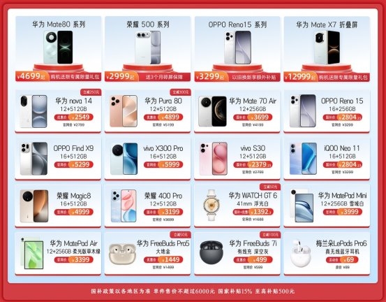 海量爆款机型+数码好物,价格直降超心动。本次活动覆盖多款新品与热销数码单品,不同价位段满足多样购机需求。新品方面,华为Mate80系列4699元起,引领科技新潮流;荣耀500系列2999元起,年轻人的时尚之选;OPPO Reno15系列3299元起,拍照性能出色;华为Mate X7折叠屏12999元起,开启折叠屏新体验。热销手机中,华为nova14 (12GB+512GB) 优惠价2549元,性价比超高;OPPO Find X9 (16GB+512GB) 售价5299元,高端旗舰彰显科技魅力;vivo S30 (12GB+512GB) 国补价2379.15元,外观时尚性能强劲;荣耀400 Pro (12GB+512GB) 国补价3199元,均衡配置实用之选。热销智能好物里,华为WATCH GT6 (41mm 浮光白) 到手价1392.3元、华为MatePad Mini (12GB+256GB 雪域白) 售价3999元、华为FreeBuds Pro5 (大地金) 售价1449元、华为FreeBuds 7i (深空灰) 优惠价499元。
