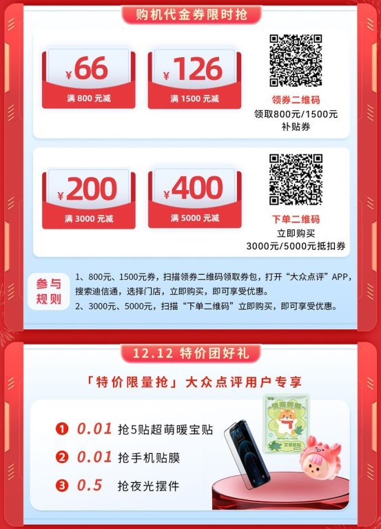 限时抢团购购机补贴,低至0.01元抢限量好礼。除上述优惠外,迪信通还在美团与大众点评平台上线了专属团购活动,双重福利不容错过。活动一:扫描活动海报「领券二维码」抢“满800元减66元”“满1500元减126元”神券,再打开“美团”或“大众点评”APP搜索进入附近迪信通门店,购买“【双12狂欢购】800元抵用券”“【双12狂欢购】1500元抵用券”,即可享受对应优惠;购买“【双12狂欢购】3000元抵用券”“【双12狂欢购】5000元抵用券”,可直接享受“满3000元减200元”“满5000元减400元”优惠。活动二:打开“美团”或“大众点评”APP进入附近迪信通门店,可0.01元购5贴暖宝贴或手机贴膜,0.5元购夜光摆件,数量有限,先到先得!