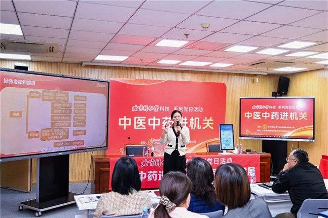针对机关职工的身体健康特点,北京同仁堂科技讲师开展了主题为《办公室常见病的中医药防治》的讲座。系统介绍了常见结节、腰肩问题、呼吸系统疾病和亚健康状态的中医认知与干预措施,内容生动且实用。