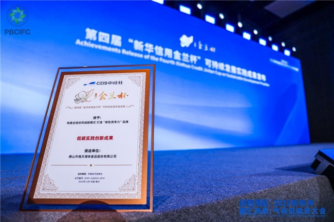 第四届“新华信用金兰杯”低碳实践创新成果于12月10日在广州南沙举行的“2025明珠湾气候投融资大会”系列活动之一“向海图强——激活蓝碳动能 助力海洋经济高质量发展”分会议上正式发布。会上,佛山市海天调味食品股份有限公司(简称“海天味业”)凭借“从源头到舌尖”全链条减碳实践以及“碳路者绿链联盟”项目,入围第四届“新华信用金兰杯”低碳实践创新成果,为调味品行业乃至传统制造业的绿色转型提供了可复制的实践样板。