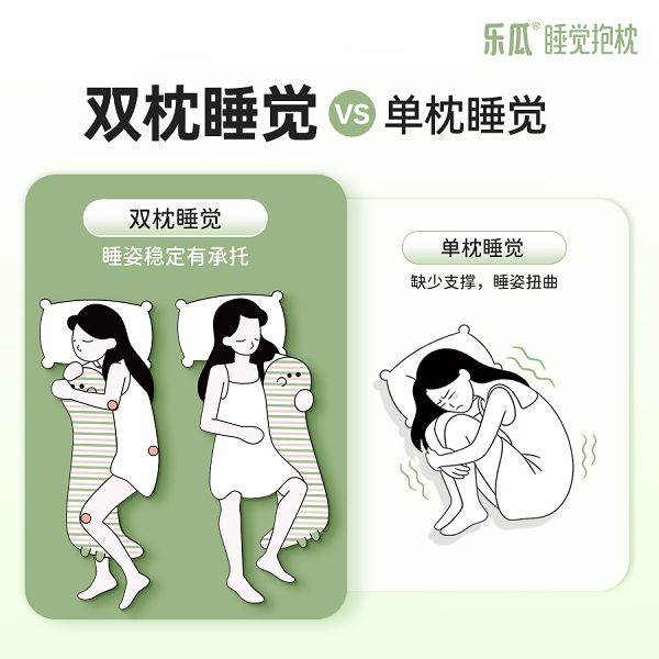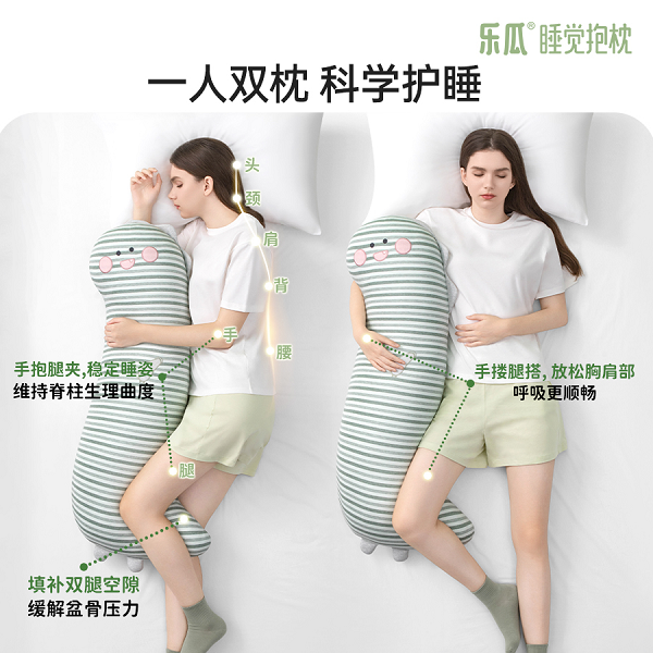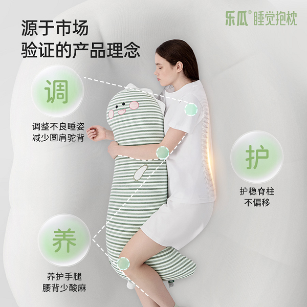 乐瓜睡觉抱枕(Sleeping Hug Pillow)充当了睡眠过程的“动态稳定装置”。它并非简单的睡眠陪伴物,而是一个符合人体工学的“支撑伙伴”。在侧睡时填补双腿之间的空隙,缓解骨盆扭转与腰椎侧弯压力;在仰睡时承托膝盖,使腰部贴合床垫,维持脊椎的自然曲度。这个“可手抱腿夹的睡觉抱枕”,补全了睡眠支撑的另一块拼图,将睡眠过程从易疲劳的“睡姿”,转变为主动精准的“护睡”。