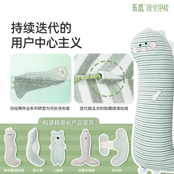 FUNMELON乐瓜的专业性亦体现在对用户痛点的持续攻关与细节优化。面对一体式抱枕清洁不便、内胆移位、拉链等使用感受的反馈,研发团队历经两年,实现全系列可拆洗布套结构的转型、内胆与布套的接扣设计、隐形拉链与布兜使用。此项改造涉及内芯固定方式与外层工艺的全面重构,从根本上解决了卫生维护难题。如今这几项已成为行业的基础要求,极大推动了睡觉抱枕的行业发展。