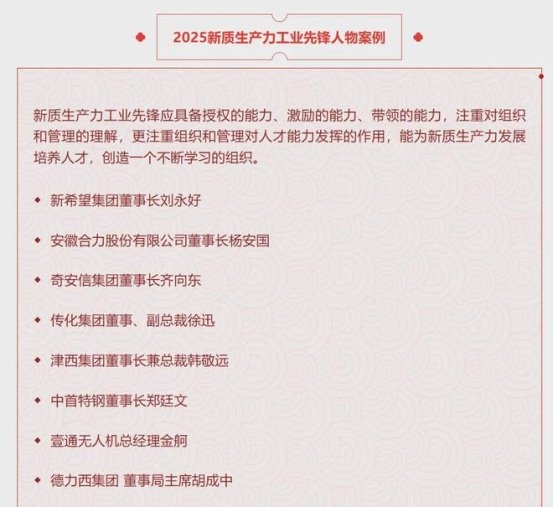 近日,中国工业报社发布“寻找新质生产力领跑者案例”榜单,德力西集团董事局主席胡成中凭借在引领产业高质量发展中的突出贡献,获评2025新质生产力工业先锋人物,成为行业高质量发展的标杆人物之一。