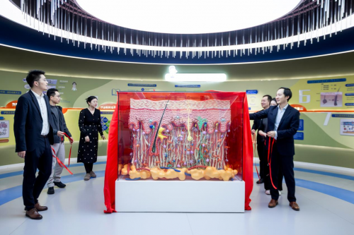 2025年12月23日,佰鸿集团更进一步,与常熟高新技术产业开发区管委会陶传龙副主任、常熟高新技术产业开发区招商局 苏春浩副局长、常熟市电子商务协会 张佳副主任、常熟市场监督管理局 谢里繁一起,在世界皮肤科学馆开启全球首个最大尺寸、最高精度的3D皮肤模型的揭幕仪式。以1:10000 等比放大,该模型长宽均为1.65米,高1.2米,在宏观尺度精准复现皮肤微观架构,为中国乃至全球皮肤科学树立一个全新的、可视化的研究参照标准,推动整个领域从模糊走向清晰,从片段走向系统。